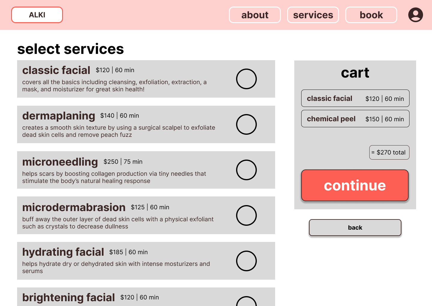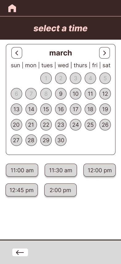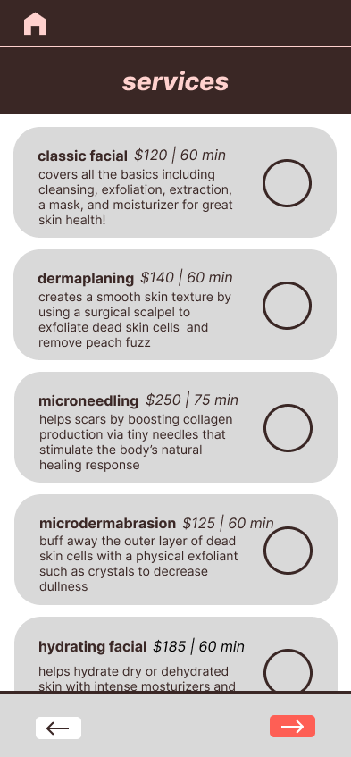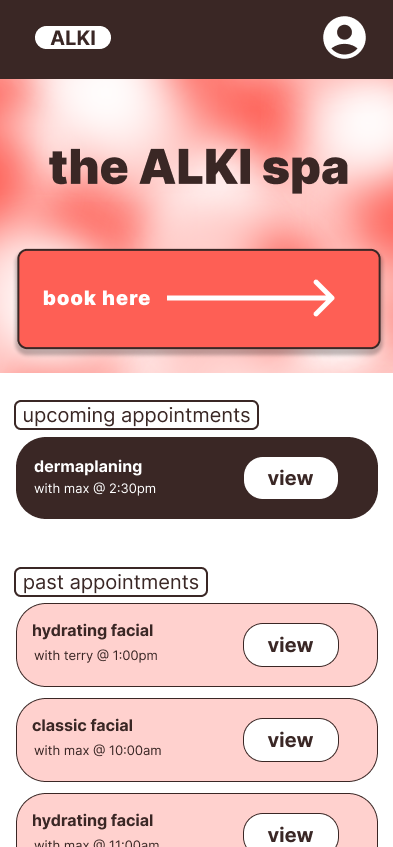 After several rounds of editing and feedback, the final design of the ALKI spa website and app features a user-centered design, prioritizing intuitive navigation and thoughtful accessibility features. The final product balances a calming, spa-inspired aesthetic with functional, goal-driven design decisions that support both user needs and business objectives.