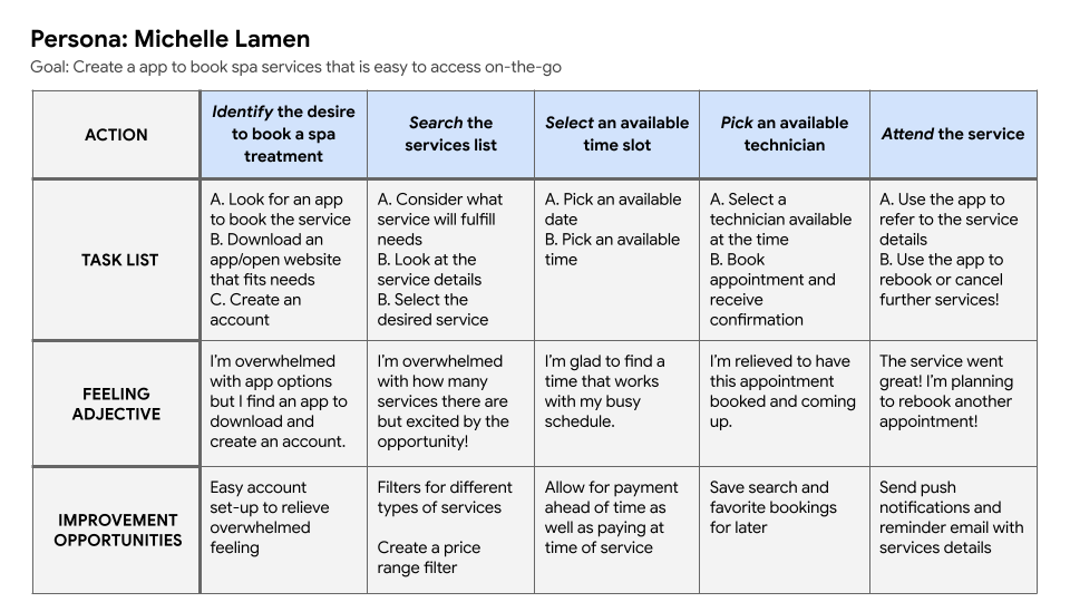 GOALS - Katie wants an easy and convenient way to book spa services in order to relax.